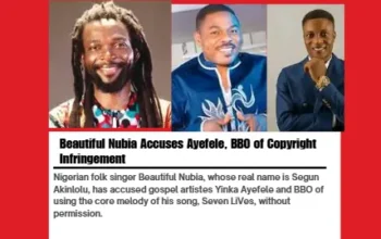 Nigerian folk singer Beautiful Nubia, whose real name is Segun Akinlolu, has accused gospel artistes Yinka Ayefele and BBO of using the core melody of his song, Seven LiVes, without permission. In a