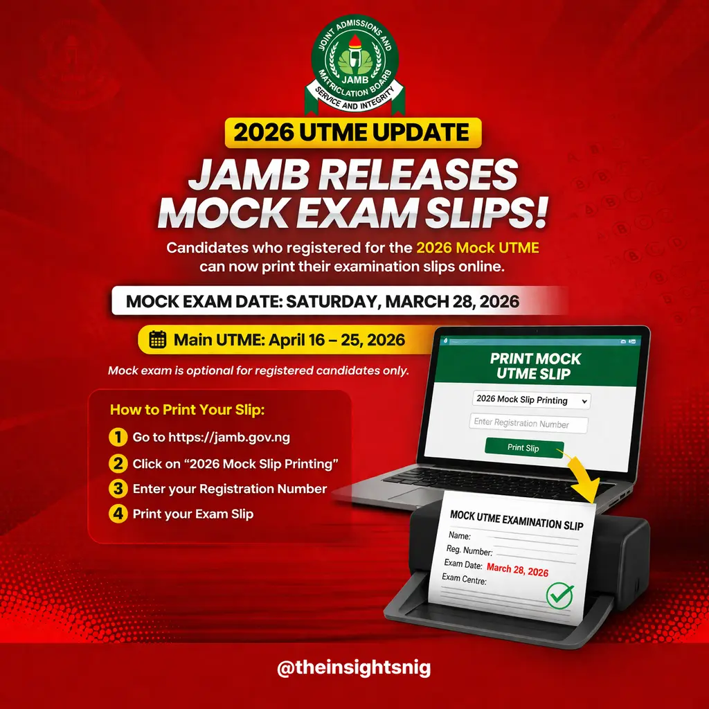 The Joint Admissions and Matriculation Board (JAMB) has officially announced that candidates who registered for the 2026 Mock Unified Tertiary Matriculation Examination (UTME) can now print their examination slips.