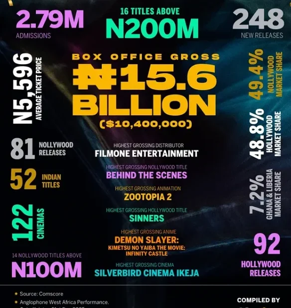 Photo Credit: FilmOne The West African cinema industry recorded remarkable growth in 2025, generating a total box office gross of N15.6 billion from theatrical releases across the region. This performance reflects a rising cinema culture and a growing appetite for both local and international