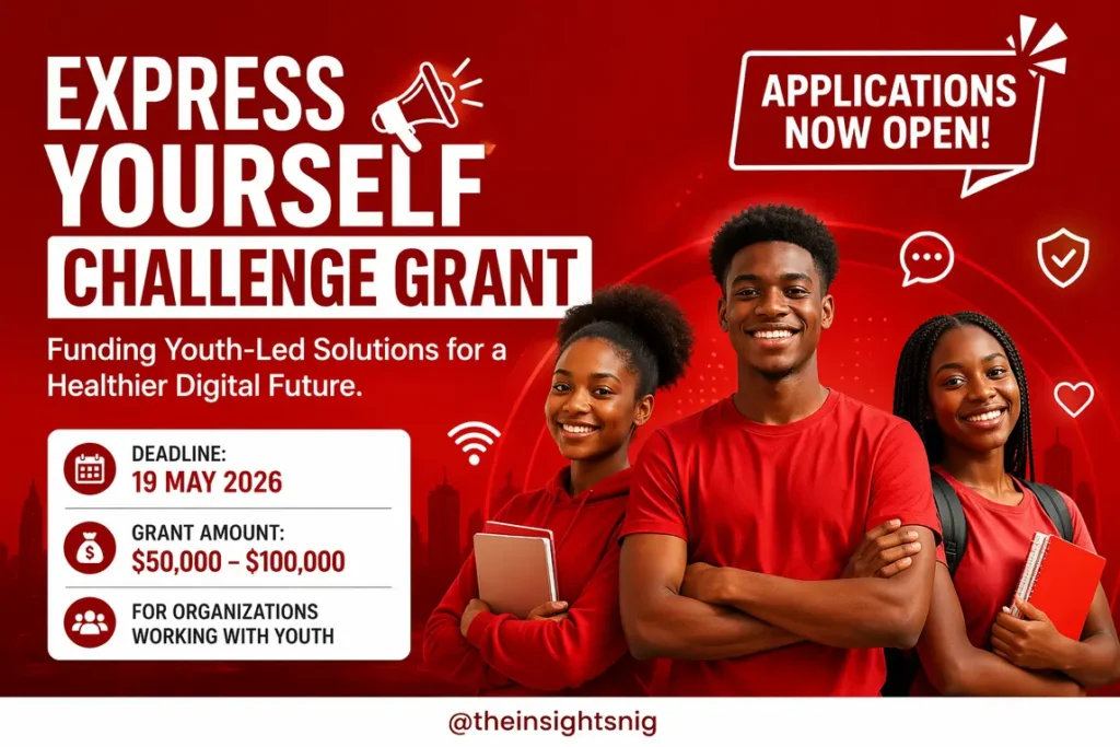 The Express Yourself Challenge Grant 2026 (US) is now open for applications with a confirmed deadline around May 19, 2026. The fund supports youth-focused projects addressing digital wellbeing, identity, and online safety with grants of up to $100,000.